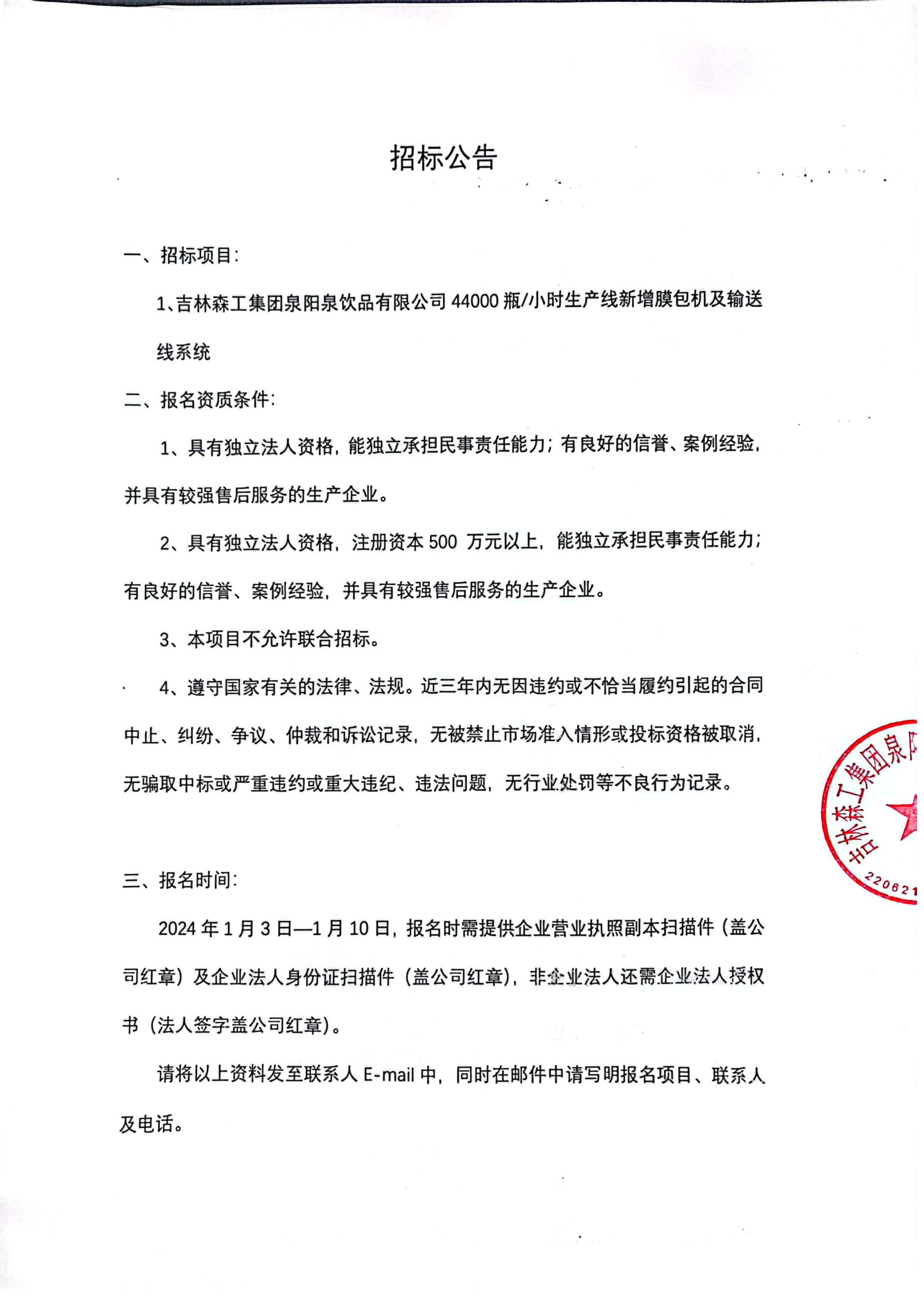 44000生產線新增膜包機招標公告